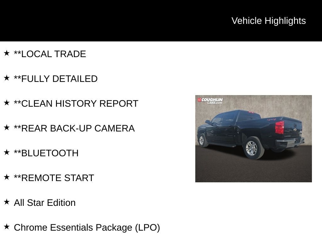 Step inside and you'll be greeted by a host of premium features, including dual-zone automatic climate control, a 110-volt power outlet, and a remote vehicle starter system. The All Star Edition further enhances the Silverado's capabilities with the addition of a locking differential, LED fog lamps, and a chrome recovery hook package.